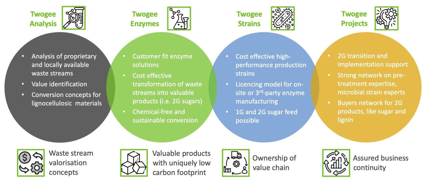 Twogee Biotech specializes in enzyme discovery and the design of customized enzyme mixtures tailored to diverse applications. With expertise in production strain development, we create high-performance solutions for the enzymatic degradation of agricultural wastes of all kind, including straw from wheat, barley, miscanthus and rice, corn stover, bagasse, soft and hard wood. Our innovative platform approach enables the efficient breakdown of all residues, driving sustainable processes for industries seeking to convert biomass into valuable products. By leveraging cutting-edge enzyme technologies, Twogee Biotech supports the transition to a circular economy through enhanced waste valorization.
